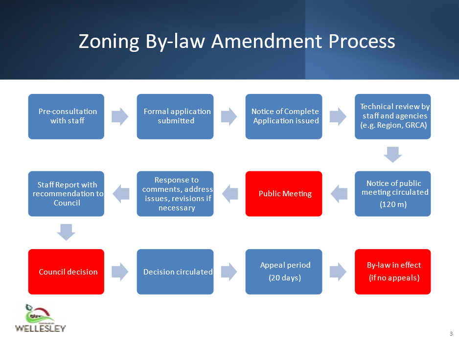Before Council passes a Zoning By-law, it must first give as much information as possible to the public. There must also be at least one public meeting before a bylaw is passed and everyone who attends the meeting must have a chance to speak. Notice of this meeting is given at least 20 days in advance, either through local newspapers or by mail and posted notice. The general planning process for a Zoning By-law amendment application is described in the following graphic:
